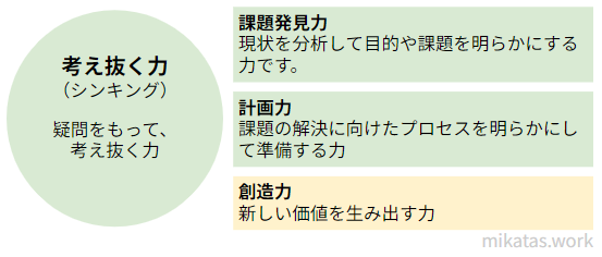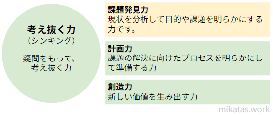 考え抜く力に含まれるのは、課題発見力・計画力・創造力の3つです。