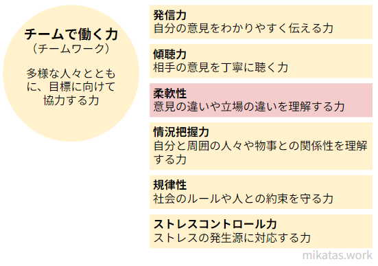 柔軟性は意見の違いや立場の違いを理解する力です。「チームで働く力」に含まれます。例えば、自分のルールややり方に固執するのではなく、相手の意見や立場を尊重し理解することです。