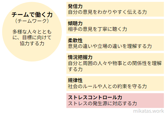 ストレスコントロール力はストレスの発生源に対応する力です。「チームで働く力」に含まれます。例えば、ストレスを感じることがあっても、成長の機会だとポジティブに捉えて肩の力を抜いて対応することです。