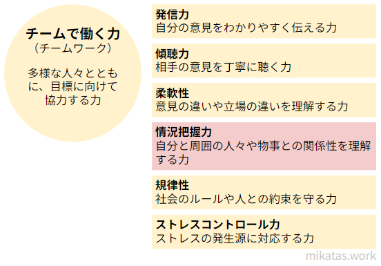 情況把握力は自分と周囲の人々や物事との関係性を理解する力です。「チームで働く力」に含まれます。例えば、)チームで仕事をするとき、自分がどのような役割を果たすべきかを理解することです。