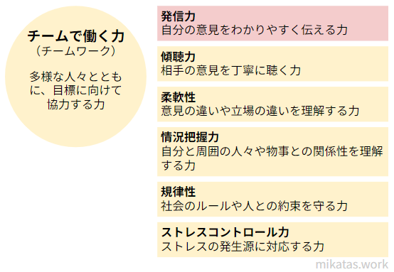 発信力は自分の意見をわかりやすく伝える力です。「チームで働く力」に含まれます。例えば、自分の意見をわかりやすく整理した上で、相手に理解してもらうように的確に伝えることです。
