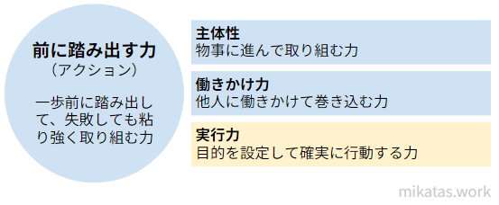 前に踏み出す力に含まれるのは、主体性・働きかけ力・実行力の3つです。