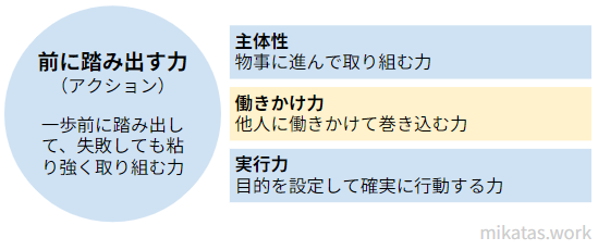 • 働きかけ力…他人に働きかけて巻き込む力