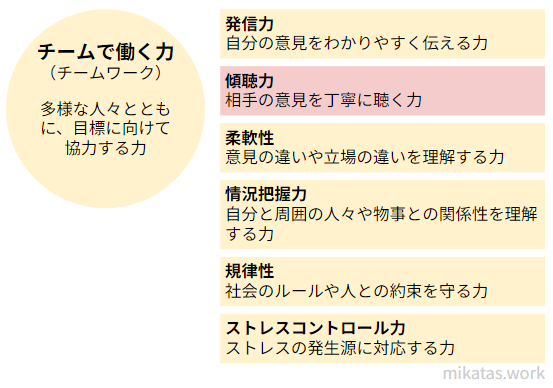 傾聴力は相手の意見を丁寧に聴く力です。「チームで働く力」に含まれます。例えば、相手の話しやすい環境をつくり、適切なタイミングで質問するなど相手の意見を引き出すことです。
